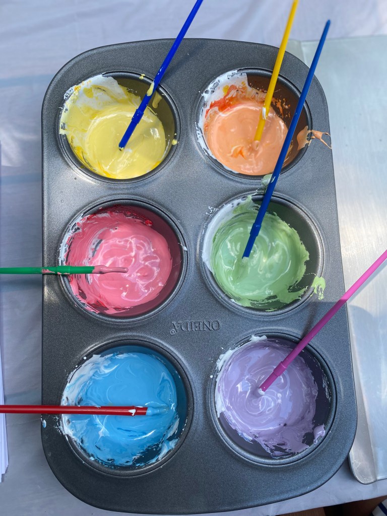 To make the paint, I added 2 spoonfuls of marshmallow puff to each muffin tin. We reviewed the primary colors (red, blue, yellow). With a toothpick, I added a little bit of red, blue, and yellow to separate tins. More food gel/dye = darker the color. With a knife, they mixed the gel with the marshmallow fluff to create each color.