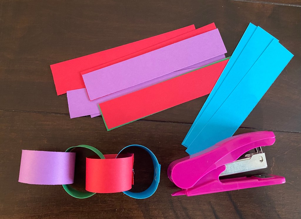 2.) Chain: Choose what material you want to use (see note above). Having the paper horizontal, cut about one inch strips across. Then cut each strip in half. To connect, bring each end together(overlap) and staple. after the first chain, make sure the rest of the chains connect by hooking them through each other.