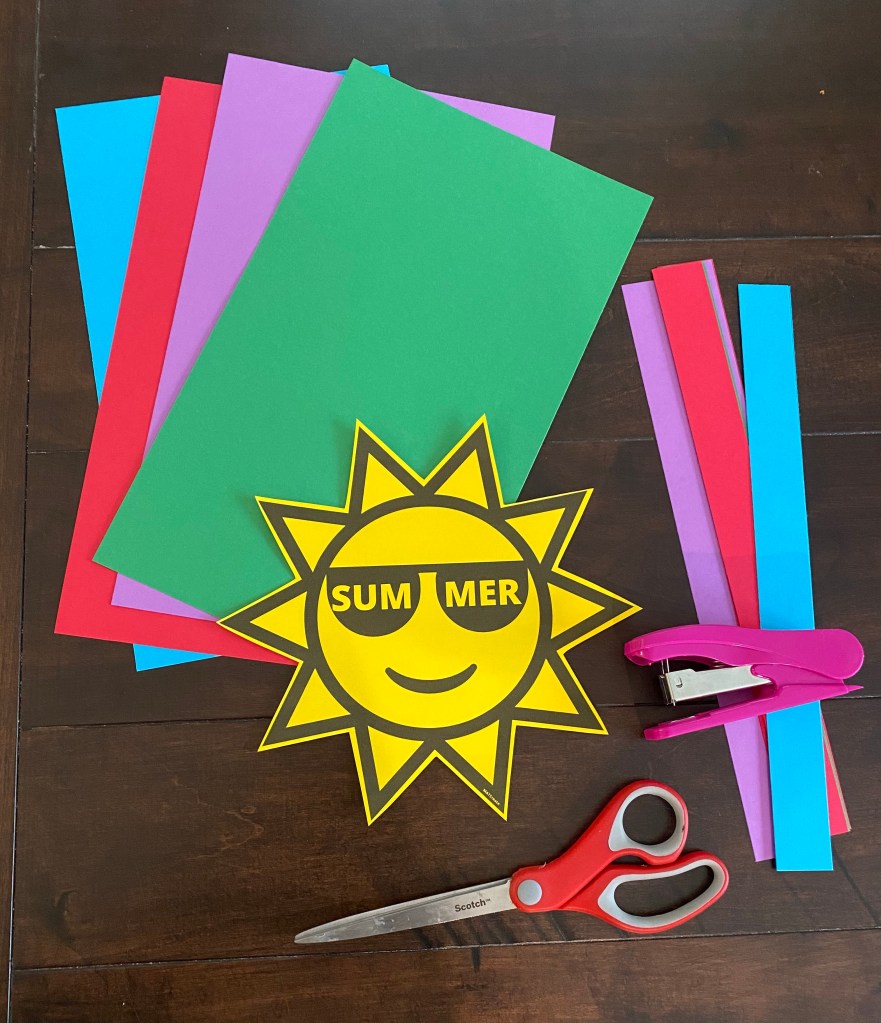 Note: For the sun, you can make multiple ways. 1- Print in color ink (yellow), 2- print on yellow cardstock (like example), or 3- print on white cardstock and have your child color in (watercolors, markers, crayons). The chain can be made with cardstock, ink jet paper, or construction paper.